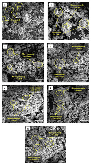 SEM images of metakaolin geopolymer coating: (a) GP; (b) GPTiO2; (c) GPTiO2Zn0.1; (d) GPTiO2Zn0.3; (e) GPTiO2Zn0.5; (f) GPTiO2Zn0.7; (g) GPTiO2Zn0.9.