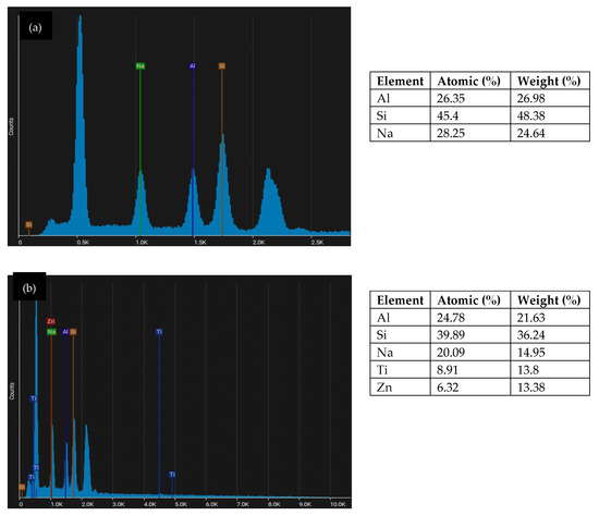 Figure 8a illustrates the EDS spot analysis for metakaolin geopolymer coating (GP) which shows the samples present homogenous chemical compositions with main elements consisting of sodium (Na), aluminum (Al) and silicon (Si). From Figure 8b, it is noticeable that the geopolymer matrix comprises the Al, Na, and Si with the trace of doping Ti and Zn. This element mentions confirmed the formation of N-A-S-H aluminosilicate binder nucleation which is responsible for the high strength. Decreasing Na content was observed with the replacement of Ti and Zn. When the Ti and Zn filled the Na+, the voids on geopolymer structure will improve and increase the strength.