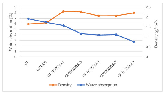 The relationship between water absorption and density of metakaolin geopolymer coating is illustrated in Figure 9. The graph presented a clear illustration of an inverse correlation. As density from different mix designs increased, the water absorption from different mix designs decreased. As shown in SEM images previously, the decreased water absorption that occurs as a result of an increase in density is due to the microstructure geopolymer matrix being denser, more compact, and decrease in the number of pores. In addition, the incorporation of TiO2 and ZnO into the geopolymer matrix helped to fill the small holes and enhance the microstructure of the material [50]. Zidi et al. [51] and Guzman et al. [25] reported similar findings that discovered the relationship between water absorption and density and found that the optimum ratio was GPTiO2Zn0.5. Consequently, this resulted in an improvement in both the water absorption and density of the metakaolin geopolymer coating [52]. The results demonstrated clearly that the addition of ZnO led to an improvement in the structural properties of geopolymers.