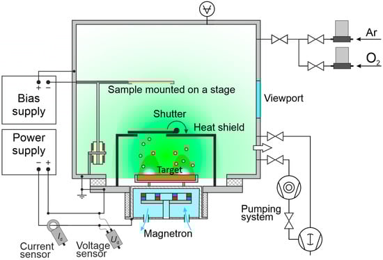 The vacuum chamber was pumped down to a base pressure of 10−4 Pa with a turbomolecular pump backed by a multi-stage dry Roots pump. The working gases (argon, oxygen, and their mixtures) were supplied by automated mass-flow controllers El-Flow (Bronkhorst High-Tech B.V., AK Ruurlo, The Netherlands). DC discharge power supply APEL-M-5PDC-800 (Applied Electronics, LLC, Tomsk, Russia) was operated in the range 500–3000 W.