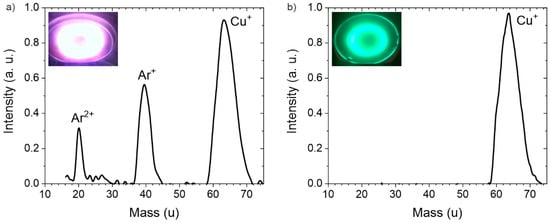 Figure 3 shows mass spectra of the ion flux from magnetron plasma to the substrate area for a cooled (Figure 3a) and a hot copper target magnetron in gasless mode (Figure 3b).