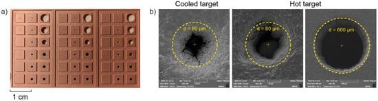 Both cooled- and hot-target magnetron deposition methods demonstrated nearly the same ability of filling the through holes. Photograph of a substrate with laser-drilled holes with minimal diameter of 10 µm after copper deposition is shown in Figure 4a. Figure 4b shows SEM images of 80-µm diameter hole coated in cooled target mode and in hot-target evaporative mode together with that of a large 600-µm diameter hole.