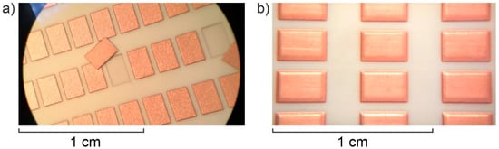 To provide statistical representation, we prepared Cu films in the pattern of several tens of isolated island areas. This was done in two ways. The first one was the deposition of copper inside an array of laser-engraved cavities in planar alumina substrate. The bottom surfaces of cavities were textured with laser and had larger roughness than the initial alumina substrate. The results of deposition are shown in Figure 5a. The second method was to deposit copper on a planar alumina substrate through a shadow mask with an array of rectangular openings. The results are shown in Figure 5b.