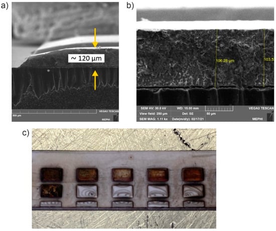 Propagation of a crack is clearly visible in the interface region. Probably it originated from heat shock during the laser cutting of the sample. However, the following 20–250 °C thermal cycling led to copper delamination from regions outside the cutting edge area after ~10 cycles (see Figure 6c). Thermal cycling therefore results in formation and/or development of such cracks that stimulate delamination process. Thickness of the copper islands was 100–120 μm.
