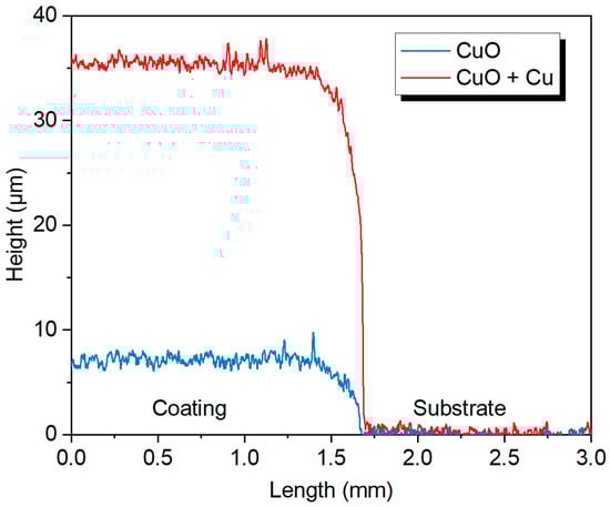 Figure 7 shows the profiles of the coating substrate steps formed during the deposition of CuO coating and composite CuO + Cu film. A special alumina shadow mask was used to prepare coating steps suitable for profilometry.