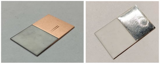 Alumina substrates (60 mm × 48 mm × 0.5 mm plates, Al2O3 96%, GN Electronics, Moscow, Russia) were prepared by laser cutting and drilling. For some experiments, smaller substrates 24 mm × 15 mm × 0.5 mm were laser-cut from the original plates. All samples were cleaned in an ultrasonic bath with ammoniacal hydrogen peroxide solution.