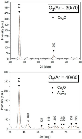 XRD diffractograms of coatings are shown in Figure 10. Peaks were identified according to Crystallography Open Database (COD): Cu2O (COD entry 9007497), Al2O3 (COD entry 1000017).