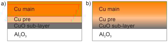 It is worth noting that a hot-target magnetron in HiPIMS mode [26] could virtually be suitable for realizing all described stages in a single run. By starting the magnetron discharge in oxygen atmosphere, gradually increasing power, decreasing oxygen flow, and, finally, entering gasless self-sputtering mode with liquid copper target, the gradient coating structure as in Figure 11b can be realized in a single continuous process. The interface CuO–Al2O3 region in this case should stimulate oxygen diffusion between substrate and coating and improve the adhesion in a way similar to DBC method.