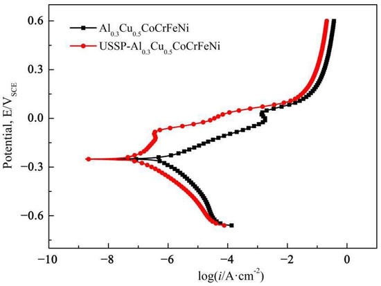 Potentiodynamic polarization curves of the as-cast and USSP-processed Al0.3Cu0.5CoCrFeNi HEAs.