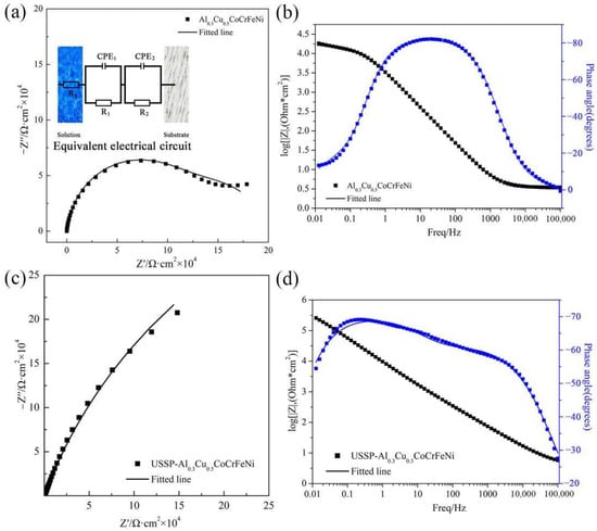 Nyquist (a) and Bode (b) diagrams of the as-cast Al0.3Cu0.5CoCrFeNi specimen. Nyquist (c) and Bode (d) diagrams of the USSP-processed Al0.3Cu0.5CoCrFeNi specimen. The inset of (a) is the equivalent electrical circuit for this test.