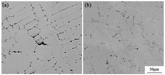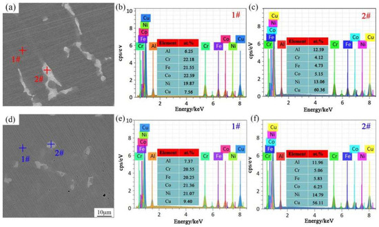 where Mi is the percentage of each composition, i represents the composition, n is the number of peaks, and Ai is the intensity of each peak. Figure 8 shows the percentages of the Al, Cr, Fe, and Cu species in passive films formed on the as-cast and USSP-processed HEAs. It can be seen that the content of Al3+ and Cu2+ in the passive film decreased from 98.4% to 93.5% after USSP processing, and the contents of Cr3+ and Fe2+,3+ in the film changed little—indicating that the USSP did not affect the formation of the main protective oxides (Cr2O3 and Fe2O3) or the bi-layer structure of the passive film [28]. However, the lower content of Al, Cu oxides and hydroxides was beneficial for preventing the formation of porous films on the USSP-processed Al0.3Cu0.5CoCrFeNi specimen [29], resulting in better corrosion resistance. According to the XPS results, it seems that the USSP process should not produce such an obvious effect on the corrosion resistance and antibacterial properties of Al0.3Cu0.5CoCrFeNi via the strengthening of its passive film; this issue was further clarified by microstructure observations and compositional analyses of the Al0.3Cu0.5CoCrFeNi HEAs. As Figure 9 shows, both the as-cast and USSP-processed Al0.3Cu0.5CoCrFeNi HEAs presented with significant precipitated phases. The EDS results showed the precipitations as being enriched with Al, Cu elements and lacking Cr elements, which would lead to severe galvanic corrosion between the Cr-depleted precipitation and the alloy matrix. The USSP process changed the precipitation morphology from continuously distributed long strips to scattered dots, which clearly reduced its galvanic corrosion—as shown in Figure 4. Meanwhile, the Al, Cu-enriched scattered dots increased the dissolution areas of the Cu2+ ions, leading to better antibacterial abilities in the USSP-processed alloy.
