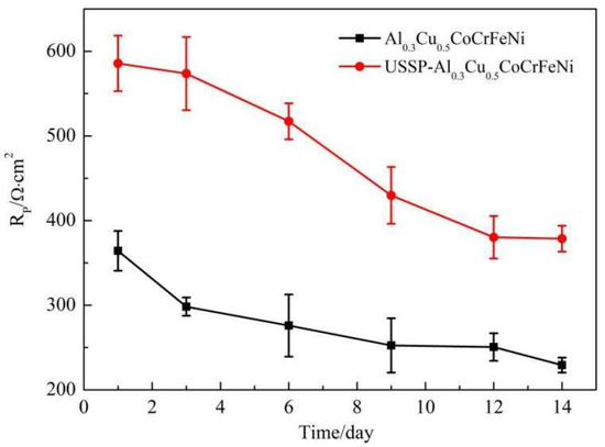 Rp variation of the as-cast and USSP-processed Al0.3Cu0.5CoCrFeNi specimens that were immersed in P. aeruginosa and inoculated medium for 14 days.