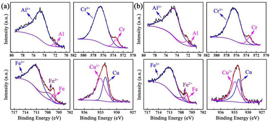 XPS spectra of the passive film formed on the as-cast (a) and USSP-processed (b) Al0.3Cu0.5CoCrFeNi specimens.