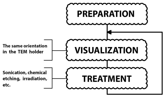 Conventionally, after the preparation procedure, which is designed to preserve the native morphology of the studied material, the sample is visualized using TEM and then discarded. The proposed alternative algorithm implies the following procedures: after the first visualization, the sample is removed from the microscope, and then undergoes some kind of treatment (sonication, irradiation, chemical etching, etc.) before being visualized with TEM again. In the present study, the sonication procedure was chosen for the treatment of synthesized hierarchical materials. Such a cycle can be repeated more than once (Figure 1). It provides not only a normal TEM visualization of the samples, but also makes it possible to compare the adhesion strength between microfibers and CNF for a few samples (up to four at a time) simultaneously. Thus, the samples first visualized intact are then treated under the same conditions and visualized once again, thus allowing one to reveal the differences in the impact of the sonication on various hierarchical materials.