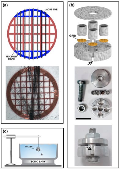 Schematic representation of the procedures used for the preparation and treatment of the hierarchical samples: (a) attachment of the microfibers to a TEM grid; (b) assembling a holder for simultaneous treatment of four TEM grids (every slot has a notch to remove the grid using sharp tweezers (marked with the arrows), scale bar 10 mm); (c) sonication treatment of the holder (the distance from the bottom (h) can be varied to adjust the intensity of the treatment).