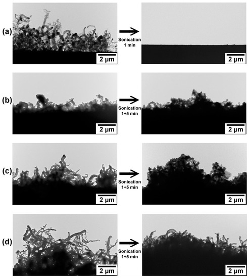 3.2. Examination of the Adhesion Strength in Hierarchical Materials by TEM Technique Coupled with the Sonication Treatment
