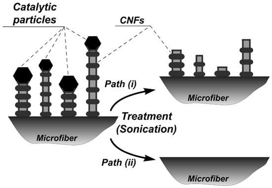 Schematic illustration of different sonication effects, which can be distinguished by means of TEM visualization: path (i)—breakage of CNFs; path (ii)—detachment of CNF from the microfiber surface.