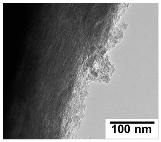 There is an example of using a sonication procedure for the examination of the adhesion strength between micro- and nanofibers in hierarchical materials in the literature [14]. Unlike that study, in the present research, TEM was used instead of SEM, and the experiments were conducted at a single-fiber level. The same microfibers were examined before and after the ultrasound treatment. In general, TEM provides more detailed imaging (Figure 5) than SEM, revealing the internal structure of nanofibers and the interfacial area. The thickness of the sample is critically important in TEM. Usually, this parameter should be approximately 100 nm. To meet this condition, typical protocols suggest removing CNF from the microfibers and depositing them on standard TEM grids [15]. In the developed method, carbon nanofibers were not detached from the microfibers. This allowed examining their distribution on the microfibers’ surface as well as the interfacial area at TEM resolution (Figure 5). Thus, the performed studies have shown that the relative adhesion strength for CNF-coated microfibers decreases in the following order: CNF/CMF > CNF/BMF > CNF/FGC.