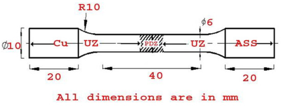 In order to assess yield strength, tensile strength, and elongation, the tensile samples were fabricated as illustrated in Figure 1. A 100 kN, electro-mechanically controlled universal testing machine was employed for the tensile test. According to the American Society for Testing and Materials standards (ASTM E8M-04), the specimen was loaded at a rate of 1.5 kN per minute to ensure the consistent deformation of the tensile specimen. After recording the load versus displacement and the specimen’s necking, the specimen fails completely. The diagram was used to calculate the 0.2% offset yield strength. The hardness across all the joints was measured using a Vicker’s microhardness testing machine (Make: Matzu-sawa, Tokyo, Japan; MODEL: MMT-X7) with such a 0.05 kg load.