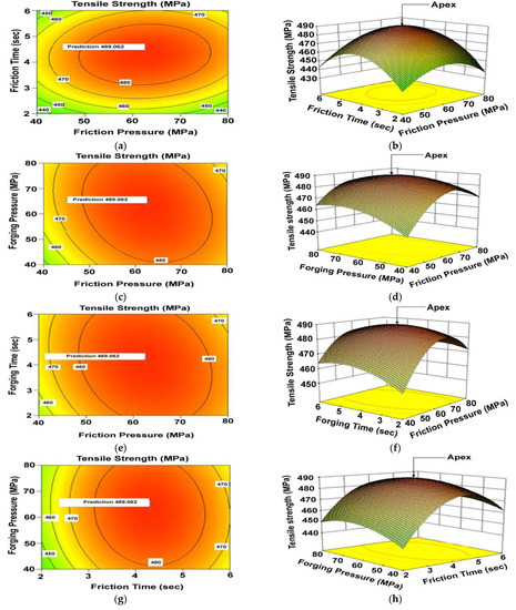 The characteristic circular mound shape in the contour plots suggests that the variables and the response may be independent of one another. To graphically depict the area of the ideal factor settings, a contour plot was created. Such a plot can be more complicated for second-order response surfaces than it is for first-order models, which can just be a simple set of parallel lines. Characterizing the response surface close to the stationary point once it has been located is typically necessary. To characterize a stationary point, one must determine whether it is a saddle point, a maximum response, or a minimum response. The easiest way to classify this is to look at a contour plot. Contour plots are essential for investigating the response surface. The optimum can be located quite precisely by characterizing the surface’s shape with the use of response surface analysis tools and contour plot production. A patterning of circular-shaped contours typically indicates the independence of the variable, but elliptical contours may indicate variable interactions. The response in the “Z”-axis, two parameters in the “X”- and “Y”-axes, and two variables in the middle level were used to generate the response surfaces for the suggested model. The response surfaces clearly show the appropriate reaction point. It is evident from Figure 3 that the TS rises as the friction pressure, forging pressure, and friction time increased until a certain point, at which point it falls.