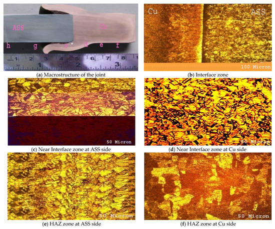 Figure 4 displays the cross-sectional optical micrographs of various regions of the welded joint made at the optimum friction-welding-process parameters. At two separate magnifications, Figure 4a,b display the weld cross-section of the dissimilar joints of an ASS-Cu joint. These micrographs obviously demonstrate the creation of an extremely thin interface area. Nevertheless, both base metals have significantly deformed regions closer to the joint line that are visible in Figure 4c,d. These regions are caused by thermomechanical action. The HAZ on the joint’s ASS side is seen in Figure 4e. The HAZ grains were recrystallized since rolling was used to create the primary austenitic phase of the base metal. However, due to the modest heat input of the welds, those grains did not appreciably increase in size. In some areas, the borders of the recrystallized austenite grains also produced the phase delta-ferrite. It has been demonstrated that ferrite grains that occur between austenite grain boundaries limit the grain growth and hot crack propagation in the HAZ. When compared to the parent metal, the grains in the HAZ on the copper side expand considerably. Near the contact, coarse granules are crucial as depicted in Figure 4f. Figure 4h shows the microstructure of the unaffected copper alloy. Figure 4g shows the microstructure of the unaffected SS. While there are no noticeable microstructure modifications on the ASS side, there are considerable microstructure variations on the Cu side close to the Cu-ASS weld interface. The full dynamic recrystallization zone and the partial dynamic recrystallization region are the names mentioned to the microstructures on the Cu side.