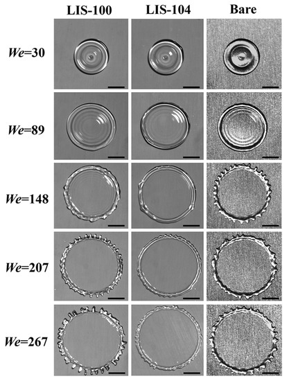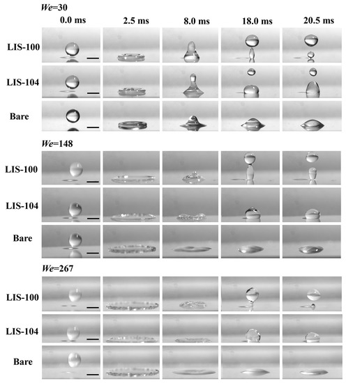 - Lee, C.; Kim, H.; Nam, Y. Drop impact dynamics on oil-infused nanostructured surfaces. Langmuir 2014, 30, 8400–8407. [Google Scholar] [CrossRef] [PubMed]