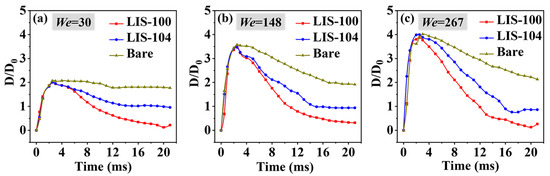 3.2. Effect of We Numbers on the Water-Droplet-Impact Behaviors