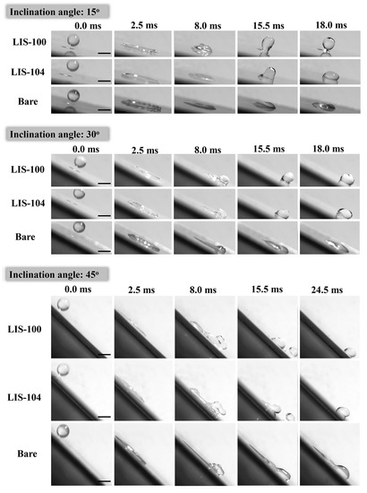 3.3. Effect of Surface Inclinations on the Water-Droplet Impact and Sliding Behaviors