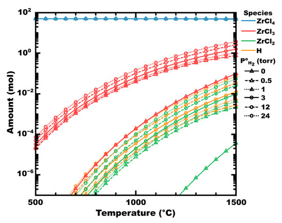 Atomic hydrogen radicals have been shown to significantly reduce the activation energy of dissociation reactions, for example, in thermal CVD of CH4 or plasma-enhanced CVD of BCl3 [81,82,83,84,85]. Accordingly, the addition of H2 to ZrCl4 might improve the dissociation rate of chlorides via the abstraction of chlorine by atomic hydrogen (Equation (5)). Indeed, the equilibrium amount of atomic hydrogen in Figure 1 is calculated to increase to a similar degree as the zirconium chlorides as P°H2 increases (i.e., ×10 to ×100, depending on temperature).