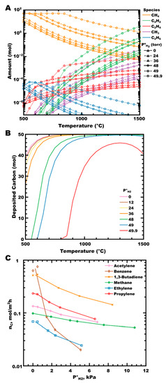 (A) The moles of hydrocarbons in CH4-H2 mixtures are at equilibrium as P°H2 increases, at a total pressure of 50 torr. Line styles (shown in black) indicate P°H2. (B) Moles of PyC deposited from 50 mol CH4 in CH4-H2 mixtures as P°H2 increases. Calculated in FactSage™ 8.1 (Thermfact Ltd. (Mont-Royal, QC, Canada) and GTT-Technologies (Herzogenrath, Germany). (C) Steady-state deposition rate of PyC from several hydrocarbons as the initial partial pressure of hydrogen increases; data taken from Refs [81,110,120], with lines added to highlight trends.