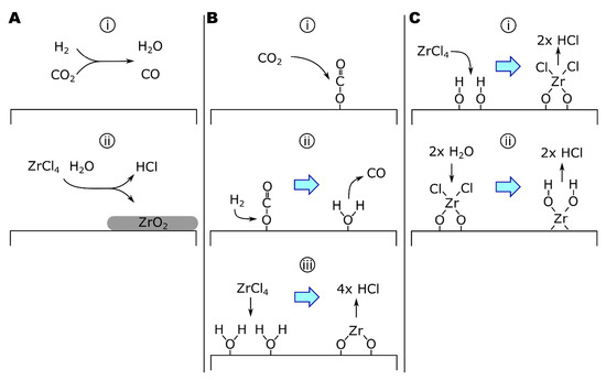 The growth of ZrO2 by ZrCl4-CO2-H2 via (A) homogeneous or (B) heterogeneous rWGS mechanics. (C) The growth of ZrO2 by ZrCl4-H2O.