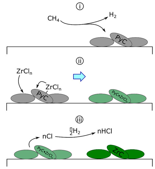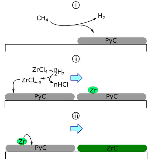 The solid-state diffusion mechanism was first proposed for the deposition of ZrC on graphite tubes by ZrCl4-H2-HCl [94]. Initially, the carbon source was the substrate itself, diffusing through the building zirconium layer to form the carbide. This concept was later altered for the codeposition of zirconium and carbon (Scheme 1) as follows: the separate deposition of carbon and zirconium, where pyrolytic carbon (PyC) deposition is described generically (Equation 6a) and hydrogen reduces zirconium chlorides homogeneously to deposit fully reduced zirconium (Equations (6b) and (6c)) as follows [68,88,89]:
