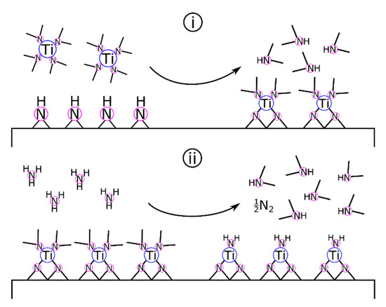 ALD of TiN. (i) The TDMAT pulse reacts with surface amides and imides. Following the inert gas purge, the NH3 pulse (ii) reduces titanium and regenerates the amide/imide surface.