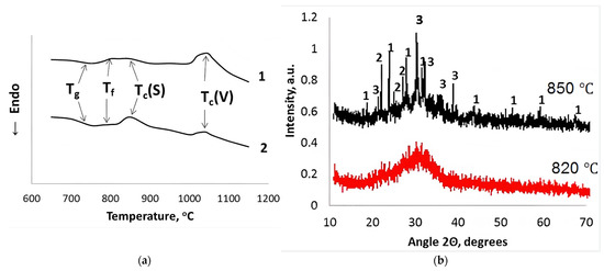 DSC data obtained for the coarse (1) and thin (2) powders of glass frit (a) and XRD patterns of the coarse glass powder fired at 820 and 850 °C (b). 1—nepheline, 2—gehlenite, 3—pyroxene. Tg, Tf, Tc(S) and Tc(V)–the temperatures of glass transition, fluidization, surface and bulk crystallization, respectively.