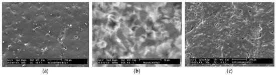 The microphotographs of the obtained coatings are reported in Figure 2. The structure of the external surface for the coating fired at 850 °C is well crystallized (Figure 2b), continuous and homogeneous, and has some inclusions of open pores. The structure of the coating formed at 820 °C is more rough and inhomogeneous (Figure 2c).