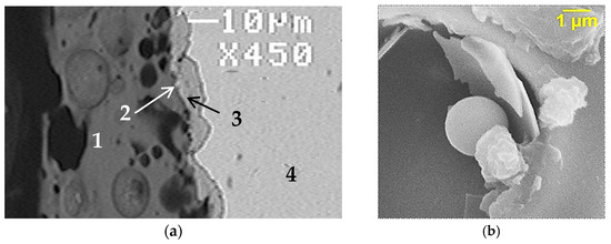 In addition, a presence of NiO in the glass composition promotes a perfect adhesion between the coating and metal substrate, achieved due to an appearance of the intermediate layer. This layer has a thickness of 2–8 μm (Figure 3 and Figure 4, Table 4) and, in accordance with the EDS point analysis data, contains the components of fritted glass and metal substrate (SiO2, CaO, NiO, Fe2O3). Thus, it is possible to assume that the phases supporting adhesion, in particular α-Fe2O3 and ferrites (NiFe2O4), formed during a firing as a result of the redox processes [31].