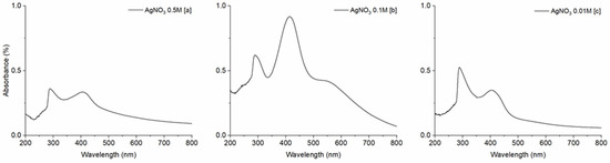 UV-Vis spectra of AgNPS in azelaic and lactic acid solution, with NaOH as precipitating agent. (a) AgNO3 0.5 M, (b) 0.1 M, and (c) 0.01 M.