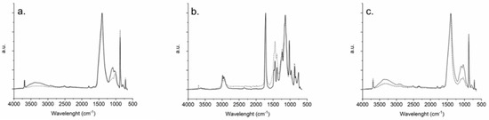 The ATR spectroscopy analyses, performed before and after ageing, show that the three coatings have good chemical stability. The spectra of the samples coated with Proconsol® (Figure 4a) and with the new chitosan-AgNPs (Figure 4c) show distinctive features of the first two strata (pigment and intonachino) underlying the coating films. The absorptions at about 1430–1395, 872 and 712 cm−1 (fundamental bands), and 2873, 2512, and 1795 cm−1 (overtone and combination bands) are ascribable to the calcite present both in the intonachino layer and, as a filler, in the yellow ochre pigment employed in the sample set investigated by ATR-FTIR. The goethite contained in the pigment can be related to a very weak band present in the spectra at 677 cm−1, and possibly to another one, superimposed to one due to quartz, falling at about 800 cm−1. Other characteristic absorptions of quartz, of which the thin-grained aggregate fraction of the intonachino layer is made, are found at about 1170, 1085, and 780 cm−1. Signals from amorphous calcite due to the carbonation of the slacked lime are found superimposed to the calcite broad ν3 band with contributions at about 1395 cm−1 and a high-wavenumber shoulder [43], while a very weak peak at 3640 cm−1 due to residual Ca(OH)2 can be recognized, indicating an almost complete carbonation. All the spectra show a sharp peak of medium intensity at about 3690 cm−1 due to Mg(OH)2, which proves, on the one hand, the presence of a dolomitic component in the commercial slacked lime, and, on the other, the different time scale of the carbonation of magnesium hydroxide process as compared to that of calcium hydroxide [44]. On the contrary, the two spectra of the Paraloid®-treated samples (Figure 4b) present a quite-different profile where, among the features due to the first two strata below the coating layer of the mock-ups, only the calcium carbonate features at about 875 and 712 cm−1 are visible as weak absorptions together with the well-defined sharp peak at about 3690 cm−1, corresponding to magnesium hydroxide. This is indicative of the thickness of the protective layer created by the product.