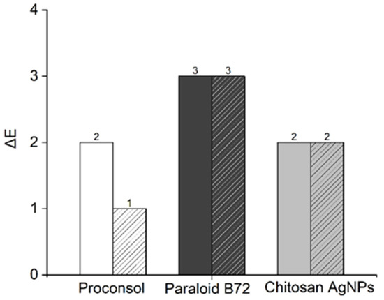 The colorimetric tests are useful to determine the color variation and the gloss change between before and after the application of the three coatings and to verify if there is any variation after the ageing process. Figure 6 summarizes the ΔE variation of the samples coated with the three products, before (on the left section) and after (on the right section) the artificial ageing process. In the sample treated with Proconsol® (White), the ΔE presents a small variation, lower than 3, and its gloss variation (ΔGloss) is, on average, equal to 0. This means that the Proconsol® coating positively passes the colorimetric test, after the artificial ageing procedure as well. On the contrary, the ΔE variation graph of Paraloid B72® (dark Grey) shows that this product reaches the color limit of the human eye detection. This means that the color change is also visible by the naked eye. Nevertheless, it is worth comparing the ΔGloss between before and after applying Paraloid B72®: unlike the other products which have a Δgloss equal to 0, it presents an average gloss of 7 (Figure S3). This glossy characteristic is a main issue for the use of Paraloid B72®, since it radically changes the aesthetical aspect of mock-ups. Finally, the mock-ups coated with chitosan and silver NPs show good colorimetric results: as reported by Bussiere et al., the exposure to UV light could photo-oxidize the polymeric film, resulting in the yellowing of the treated surface, not registered here (light Grey) [54]. All treated samples are under the limit of detection of the human eye both after the application, and after the artificial ageing cycles.