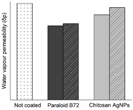 This characterization shows that Paraloid B72® is more effective in making the surface hydrophobic than the formulation presented in this study. Nevertheless, these results must be compared with the ones of the permeability to water vapor (δp) test. This test is crucial to understanding if the product that is being spread on the surface could lead to positive protective interactions or if it would result in a completely impermeable layer over the surface. Since Proconsol® does not present any hydrophobicity, for this test, only Paraloid B72® is taken as a reference product. In Figure 7, it is possible to notice that both tested products, freshly applied and aged, present a lower δp than the uncoated mock-up. However, after ageing, their water vapor permeability increases slightly. These analyses showed that the chitosan-based protective coating is more permeable to water vapor than Paraloid B72®.