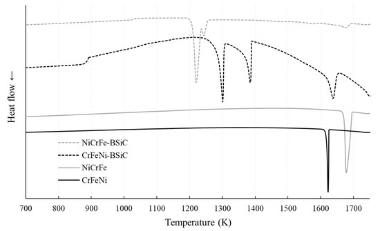 To determine the solidification behavior of the casting, measurements with differential scanning calorimetry (DSC) were carried out. The results are shown in Figure 1. The liquidus temperatures of the alloys were in the range of 1600 to 1700 K. One exothermic peak was detected in the alloys without BSiC. This indicates that only one phase was formed. The differences between the two alloys were evident in terms of their liquidus and solidus temperature. The alloy NiCrFe with a higher Ni content than CrFeNi liquefied near the melting temperature of pure Ni. In contrast, the liquidus temperature of the solid solution of CrFeNi was lower. In addition, the solidification range in the NiCrFe alloy was wider than that of the CrFeNi alloy. These peaks at higher temperatures also occurred for the alloys containing BSiC with the same amounts of Ni, Cr and Fe.