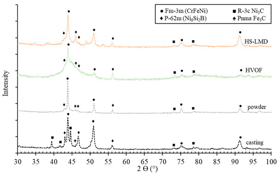 Phase analysis by XRD was performed for the different CrFeNi-BSiC manufacturing states. Figure 6 shows the resulting diffractograms. The largest diffraction peaks can be assigned to the FCC phase CrFeNi (a = 3.571 Å) of the matrix. In addition, a number of precipitates could be detected, which were most distinct in the casting. This is related to the slow solidification conditions. Only in the casted state could the trigonal Ni3C phase (a = b = 4.553 Å and c = 12.920 Å) be detected. In contrast, the rapid solidification during powder atomization suppresses segregations to a certain extent. All specimens had the hexagonal Ni6Si2B phase with a = b = 6.105 Å and c = 2.895 Å; and the orthorombic Fe3C phase with a = 5.084 Å, b = 6.738 Å and c = 4.514 Å. In the case of the HVOF coating, there was significant broadening of the main peaks of the FCC phase towards larger angles, partially overlapping other peaks. This may have been due to segregation initiation that was not fully completed by the short thermal cycling. In the case of the HS-LMD coating, there is good agreement with the casting. The powders were completely remelted during processing. Especially for the HS-LMD coating, it is not possible to assign all peaks clearly.
