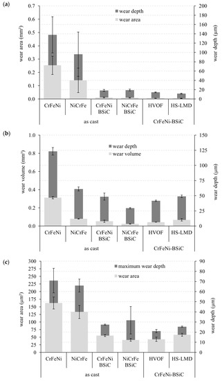 The wear behavior was investigated under sliding, oscillating and scratch conditions. The wear was determined in terms of the maximum wear depth and cross-sectional area of wear for ball-on-disk tracks and along the wear track in the case of the scratch test. The wear volume was determined for the oscillating wear calottes; see Figure 7. In a comparison of the two three-component systems, a higher resistance of the Ni-based variant can be demonstrated for all wear conditions. This was particularly pronounced under oscillating stress. The addition of BSiC caused a significant increase in wear resistance for both alloys. While almost no difference was observed under sliding stress, certain advantages of NiCrFe-BSiC were detectable under oscillating conditions. In the scratch test, the high standard deviation of the maximum wear depth of the standard variant was noticeable. In comparison to the as-cast and HVOF coating systems for CrFeNi-BSiC, higher resistance of the coating system was demonstrated for all wear conditions. The HS-LMD coating provided the best sliding-wear protection among the systems considered. However, it should be noted that under the constant test conditions, the BSiC-modified systems showed only very low wear-degradation. Under cyclic and scratch loads, the CrFeNi-BSiC alloy showed similar behavior in the as-cast and HS-LMD conditions. It can therefore be assumed that the spherical precipitation form has a positive effect, especially under unidirectional sliding loads. Overall, the results confirm on the one hand the good coating quality, and on the other hand, the fundamental suitability of the development approach for potential protective coating systems.