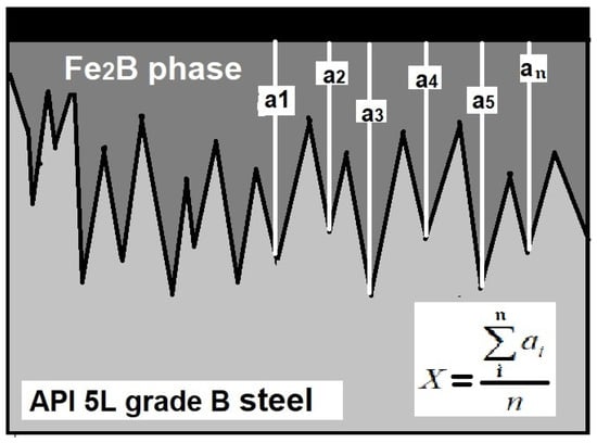 Standard metallographic techniques were used to prepare the samples for microscopic examination. The boride layers’ thicknesses were measured from the rectangular-prism specimens by optical examination using a GX-51 optical microscope (Olympus, Center Valley, PA, USA). At least 50 measurements were performed to establish a mean value of the layer thickness. Figure 2 illustrates the methodology used to establish the mean value of the layer thickness.