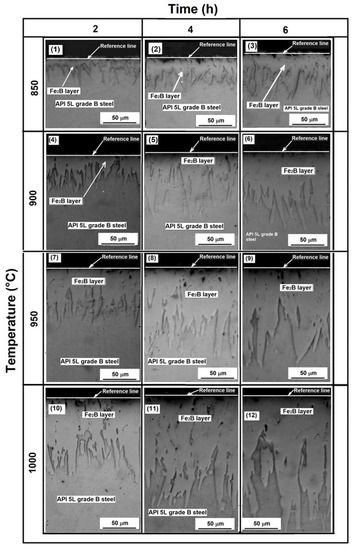 Different researchers have reported that the characteristic saw-tooth boride layer morphology is seen in low-alloy steels, unalloyed low-carbon steels, and pure iron [27,41,42]. The layers’ thickness ranged from approximately 30 to 218 µm for the samples exposed to 850 °C for 2 h and the samples exposed to 1000 °C and 6 h, respectively. The average thickness, standard deviation, and coefficient of variation of layer thickness values are summarized in Table 3, Table 4 and Table 5.