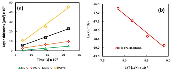 The constant of parabolic growth () can be estimated from the slopes of the square of the thickness () versus the treatment time graphs. Likewise, () has Arrhenius-type behavior, as follows: