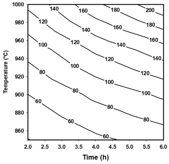 On the other hand, the layer’s thickness values obtained by Equation (9) can be used to generate a contour map that describes the behavior of the boride layers as a function of the treatment conditions. Contour maps are especially useful in industrial applications where a specific thickness of the layer can be required.