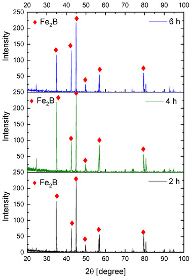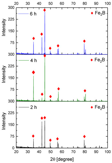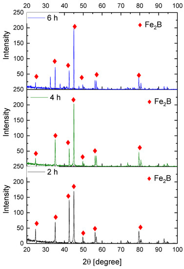 - Jiang, J.; Wang, Y.; Zhong, Q.; Zhou, Q.; Zhang, L. Preparation of Fe2B Boride Coating on Low-Carbon Steel Surfaces and Its Evaluation of Hardness and Corrosion Resistance. Surf. Coat. Technol. 2011, 206, 473–478. [Google Scholar] [CrossRef]