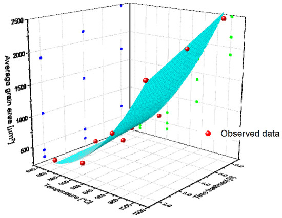 where () is the average grain area in µm2, (T) is the treatment temperature (°C), (t) is the treatment time (h), (z0), (a,b,c,d and f) are regression parameters to be determined. Table 17 shows the parameter values and the coefficient of determination (R2). Moreover, a 3D scatter plot is included for schematization purposes (see Figure 16), where it is possible to observe that the greater the temperature, the greater the average grain area. We also plotted the surface that is represented by Equation (9) with the parameters indicated in Table 17. On this surface, one can observe that the slope of the average grain area–temperature is greater than the average grain area–time, which means that the temperature exerts a stronger influence on grain growth. In addition, when it is analyzed via Spearman correlation, the correlation between the average grain area and temperature is much higher than that between the average grain area and time. This information is given in Table 18.