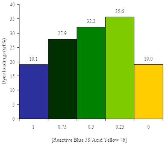 A more sophisticated analysis of the effect of total dye content in NPs on their ratio in the mixture of Acid Yellow 76 and Reactive Blue 38 dyes (Figure 1) reveals a parabolic shape with downward-directed branches, where the top is usually located in the area of comparable quantities of each dye. Such plots are typical for well-known synergistic effects of the oxidation processes of organic compounds and polymers []. It is interesting that the relationships for dye loadings are in close agreement with the relationships for dye concentrations in solutions used for the NP preparation process (1, 0.70, 0.48, and 0.24 versus 1.0, 0.75, 0.50, and 0.25, respectively). Among these effects, a special group is composed of those explained by trivial mechanisms, in accordance with which the synergistic effect is associated with the limited solubility of one or both of the additives []. This synergistic effect is due to the interactions of dyes when the adsorption of one dye does not interfere with, but rather promotes the adsorption of another. Formally, a similar effect is observed for polymer light stabilisers when one stabiliser improves the distribution (solubility) of the other in the polymer []. In the first case, each of the additives dissolves independently, and their total concentrations increase relative to their individual concentrations. In the second case, one of the additives increases the solubility of another additive, increasing its concentration in the mixture. In the case of dye adsorption, possible synergistic mechanisms may also be trivial. If each of the dyes is mostly adsorbed on centres of different types, the total content will be higher than that in the case of the adsorption of individual substances. Correspondingly, in the case of multilayer adsorption, one of the dyes may form new centres for the adsorption of another dye. Particular ratios of dye concentrations at which the synergistic effect is strongest can only be determined empirically at present, because of the lack of experimental data allowing the determination of the mechanism.